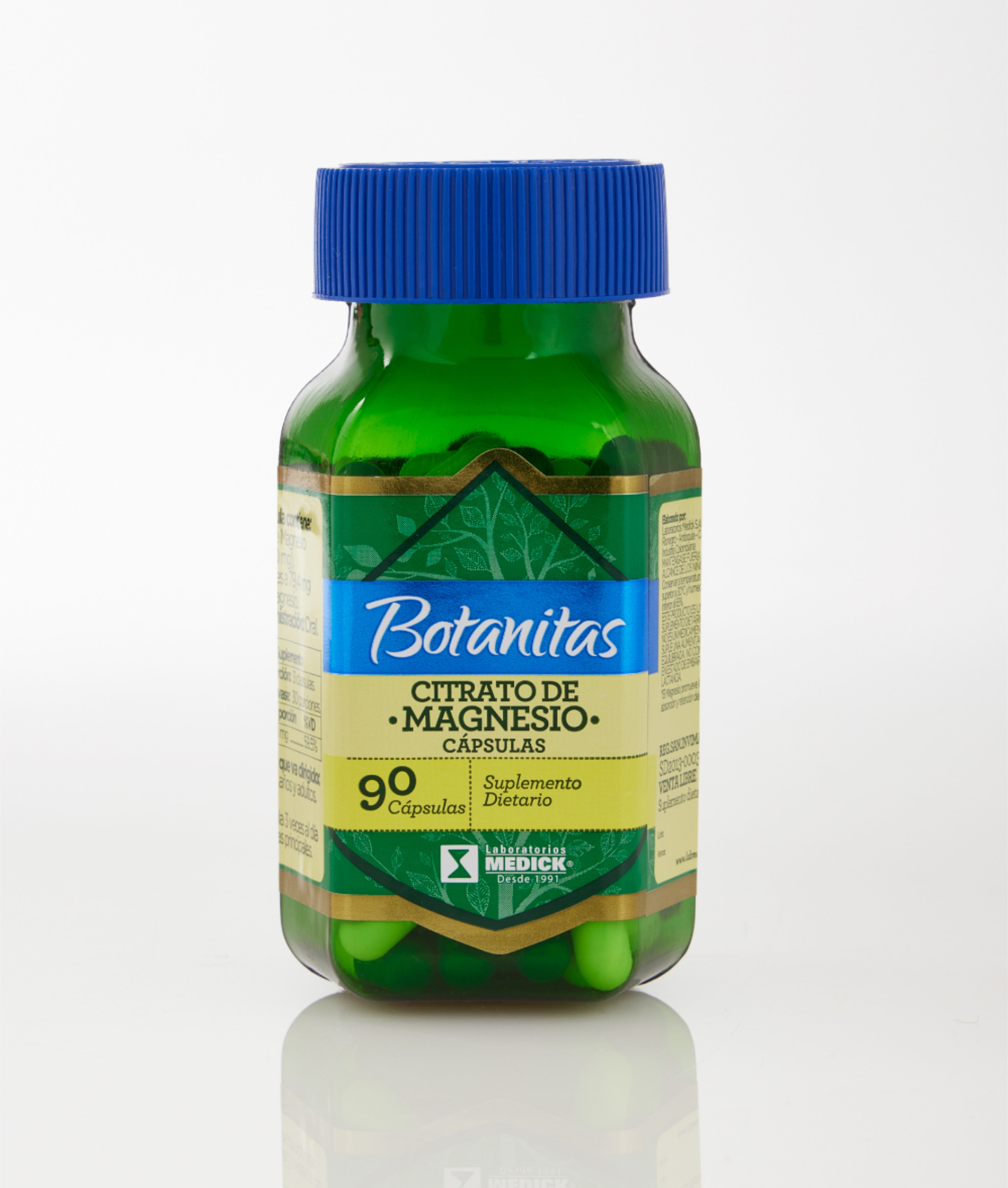 PRODUCTO DE VENTA LIBRE | Reg. San INVIMA: SD2013-0003008 Citrato de magnesio El Magnesio promueve la absorción y retención del Calcio Contenido de una cápsula: Citrato de magnesio (490 mg), equivalentes a 79,4 mg de magnesio. Vía de administración: oral Dosis diaria recomendada: Adultos –...
